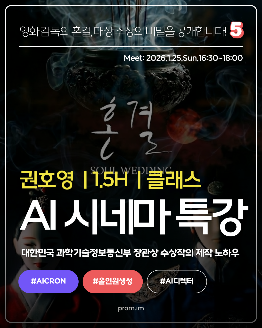 권호영 감독의 AI 시네마 특강은 그 간극을 메우는 첫 번째 기회입니다. '혼결'로 대한민국 과학기술정보통신부 장관상을 수상한 권호영 감독이 프롬에 옵니다. AI와 실사 촬영을 결합한 하이브리드 생성 기법, 영화제 출품 전략, 그리고 기술이 아닌 '이야기'로 심사위원의 마음을 움직인 비결을 공개합니다. 1월 25일(일) 오후 4시 30분, 90분의 특강입니다. 놓치지 마세요. ⤵️