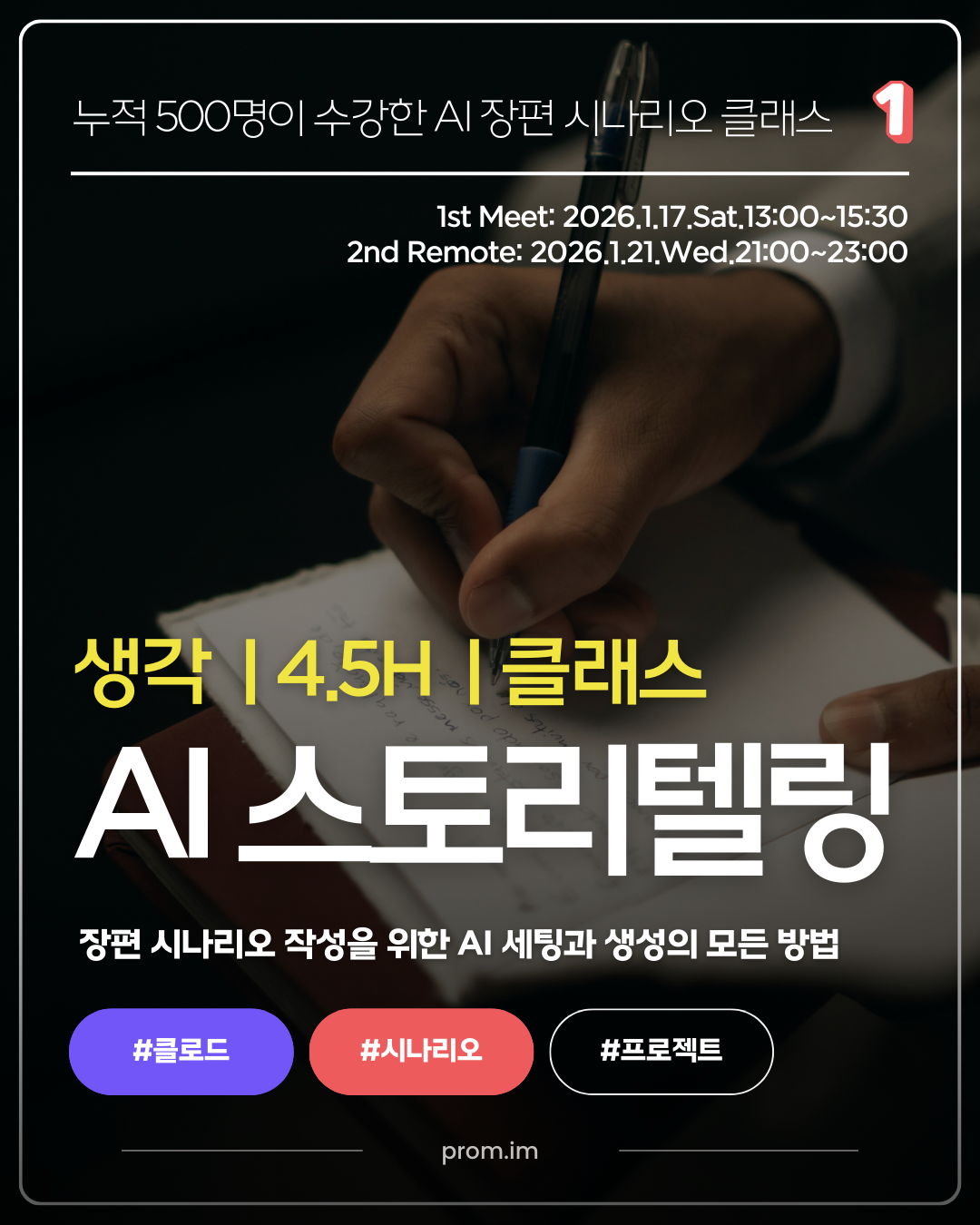 AI 스토리텔링 클래스는 클로드(Claude)를 활용해 나의 아이디어를 장편 시나리오로 설계하고 작성하는 전 과정을 다룹니다. 프로젝트 세팅, 시스템 프롬프트 설계, 시나리오 생성을 위한 프롬프트 템플릿까지. 누적 500명이 경험한 프롬의 시그니처 클래스입니다. AI는 부조종사일 뿐, 이야기를 조종하는 건 당신입니다. ⤵️ |